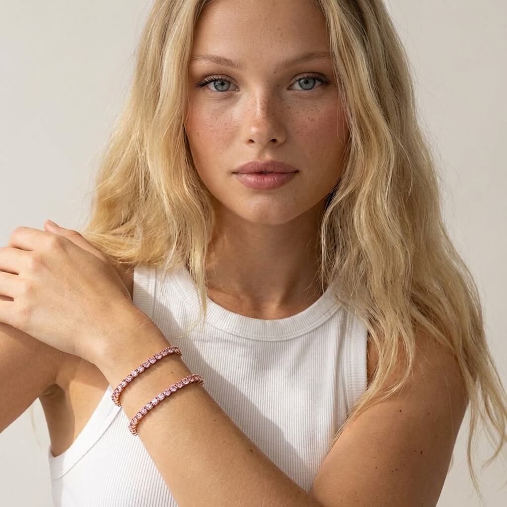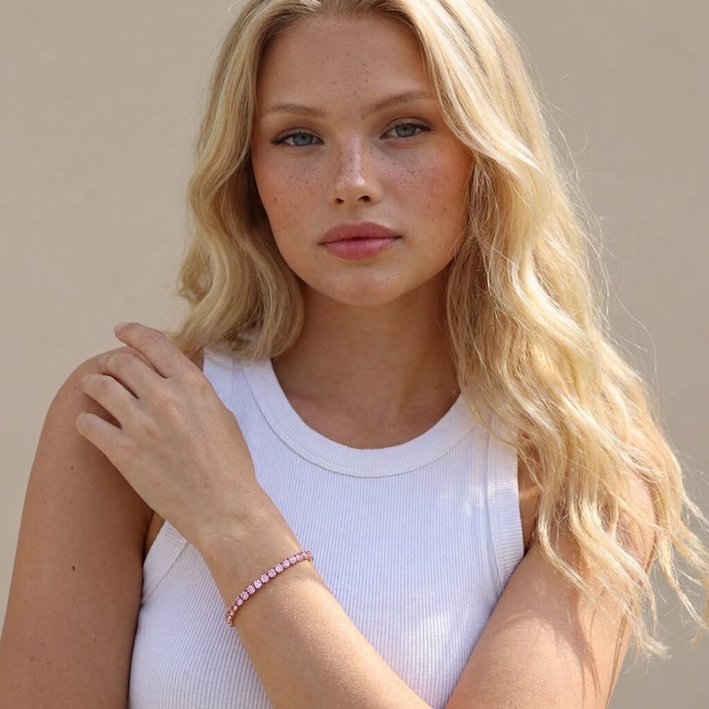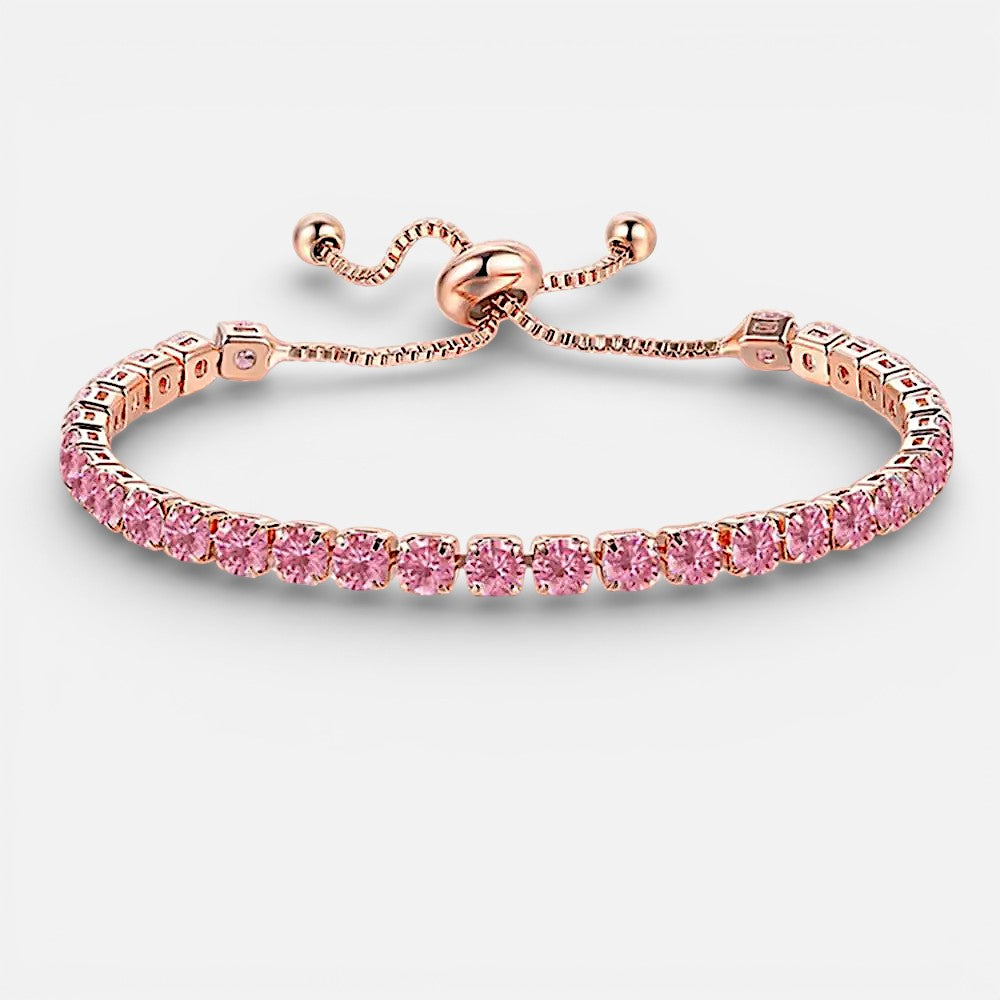Designed to catch the light from every angle, this pink crystal adjustable tennis bracelet brings refined sparkle with a soft, romantic glow. The brilliant center stone adds eye-catching elegance, while the sliding buckle allows for a perfectly customized fit. Whether worn alone or layered with your favorite pieces, it’s a statement of effortless luxury that elevates both everyday looks and special occasions.