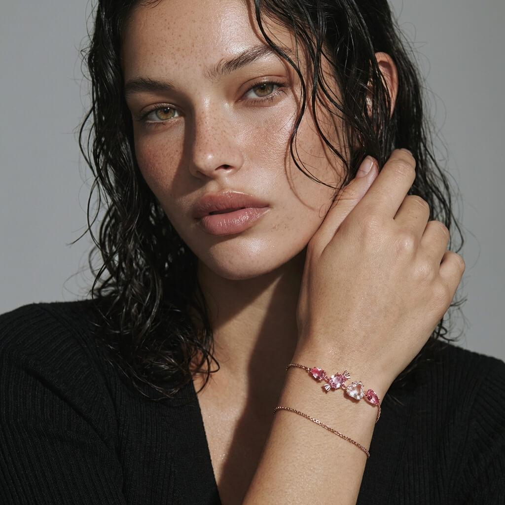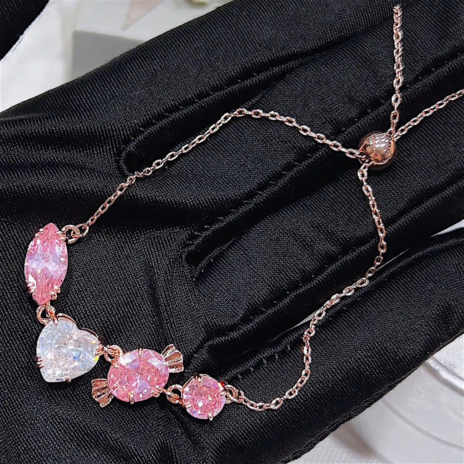 Sweet with a polished edge, this rose gold pink crystal candy bracelet brings playful charm to everyday styling. The candy-inspired sparkle paired with delicate heart details creates a look that feels romantic without being overdone. Lightweight and easy to wear, it’s designed to add a soft pop of color and personality perfect for stacking or wearing solo.