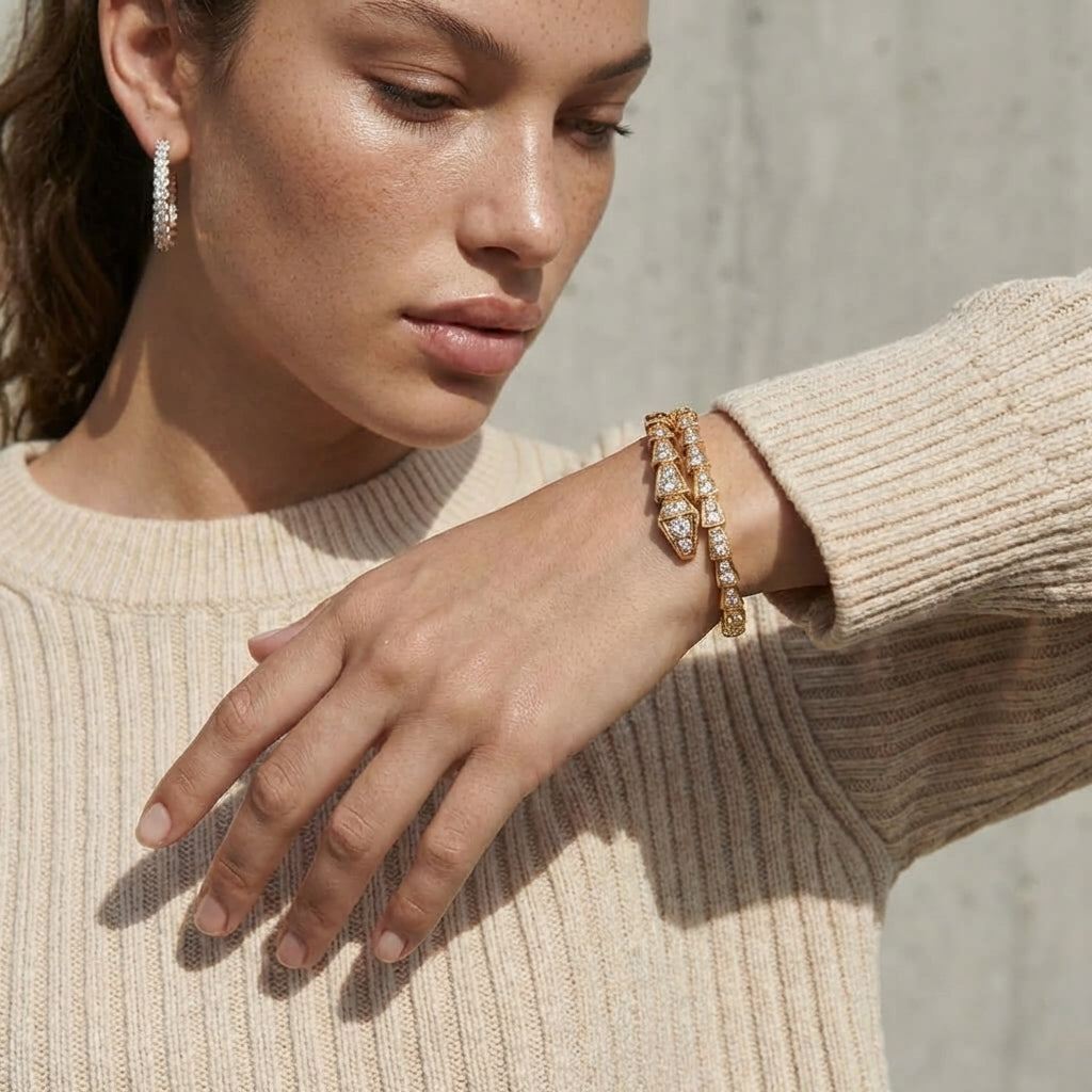 Bold, fluid, and unapologetically elegant, the Serpent Pavé Bracelet is designed to symbolize confidence and transformation. Its snake-inspired silhouette wraps gracefully around the wrist, while shimmering cubic zirconia adds light-catching brilliance with every movement. Striking yet refined, this piece elevates everyday looks and delivers undeniable presence for evening wear perfect for those who love jewelry with meaning and edge.