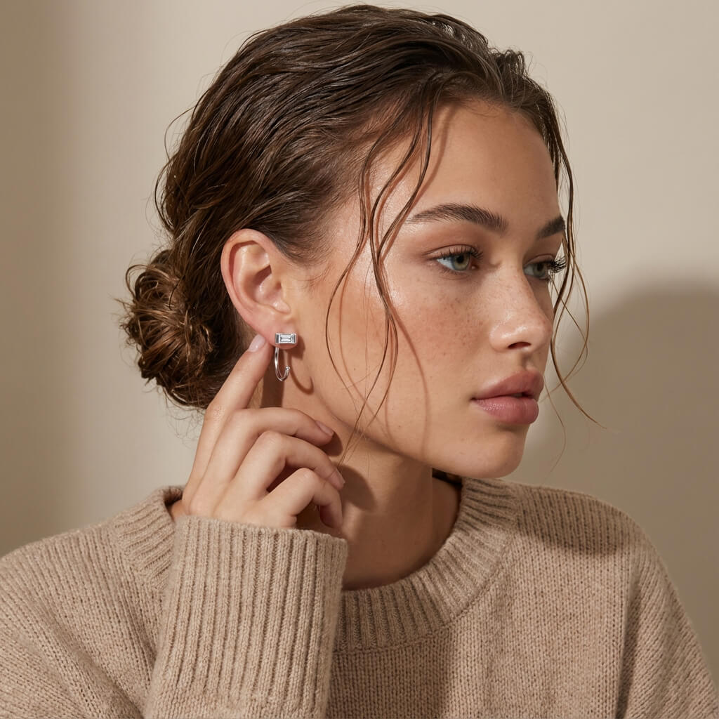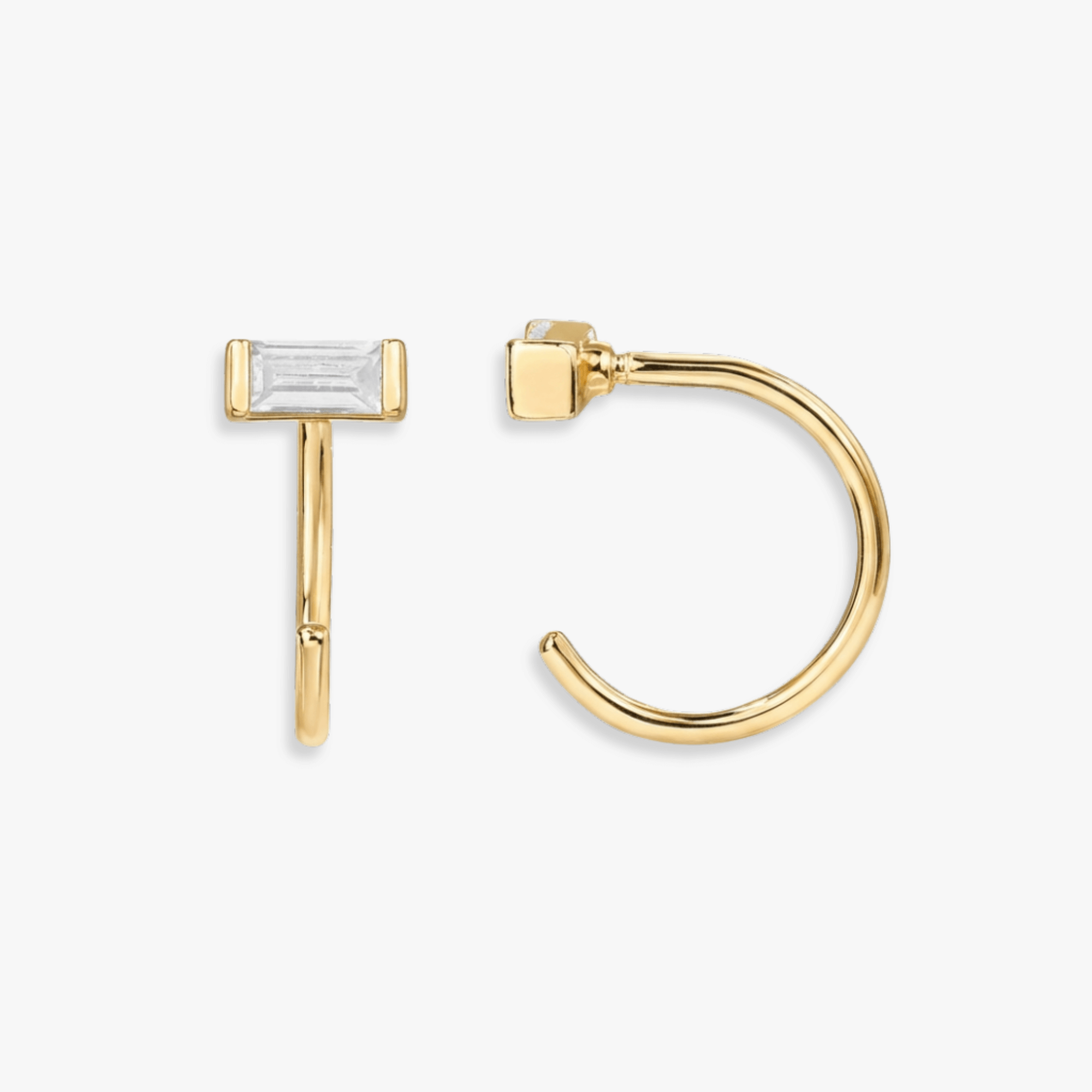 The Half Hoop Huggie Earrings blend classic structure with a clean, modern silhouette. Designed with a sleek half hoop shape and a refined rectangular accent, these huggies add subtle interest while remaining easy to wear from day to night. Their compact profile makes them a polished choice for brunches, dinners, or everyday styling, whether worn alone or paired with other earrings.