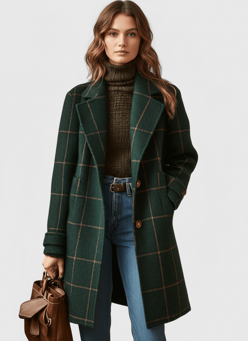 Women’s Wool Overcoat – Long Check Buttoned Design