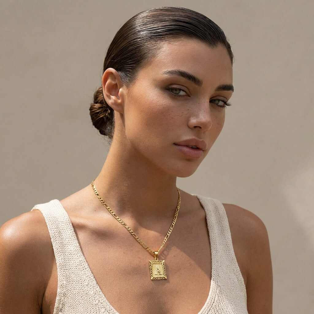 The Square Initial Letter Necklace features a bold letter pendant set within a textured square frame, paired with a classic curb-style chain for a clean and modern look. Designed to feel personal yet versatile, this necklace works effortlessly as a statement piece or layered with other chains. A timeless accessory that adds character to everyday outfits and makes a thoughtful personalized gift.