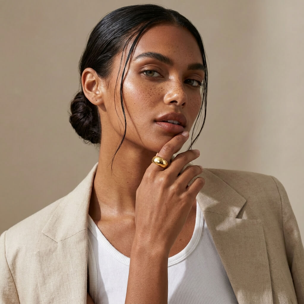 The Classic Dome Ring is a bold yet timeless piece defined by its smooth, puffy dome silhouette and tapered base for a balanced, comfortable fit. Finished with a high-shine gold-plated surface, this chunky design delivers a clean, sculptural look that stands out on its own or layers effortlessly with other rings. Its simple form makes it suitable for everyday wear while transitioning easily between casual and polished styling.