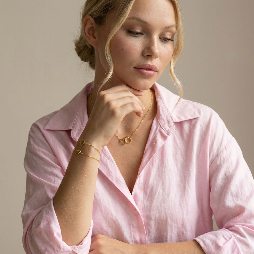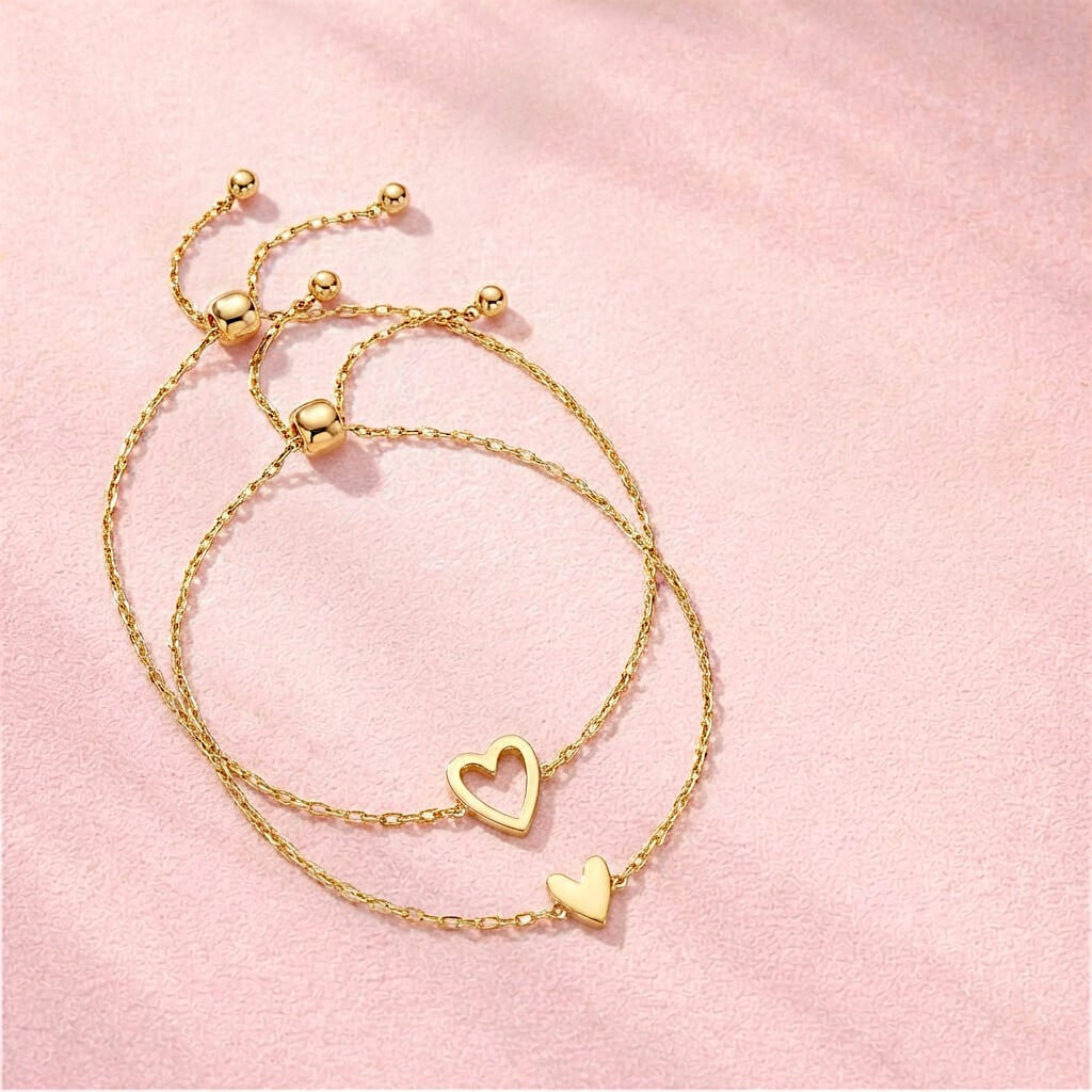 Designed to symbolize connection and closeness, the Double Heart Charm Bracelet Duo & Necklace Set is a romantic expression of love meant to be worn every day. The paired heart details create a soft, meaningful look that feels intimate without being overstated, while the adjustable bracelets and minimalist heart necklace make the set effortlessly wearable. Perfect for Valentine’s Day or thoughtful gifting, this coordinated set captures modern romance with a refined, timeless feel.