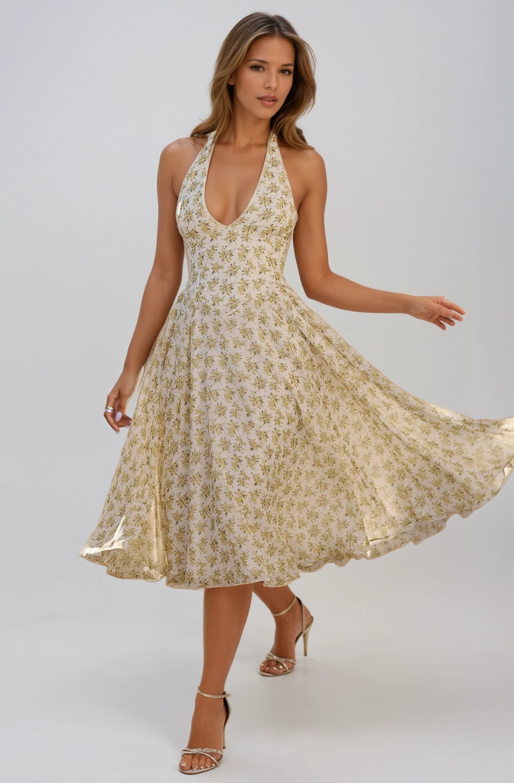 Paloma Halterneck Deep V Floral Backless Midi Dress