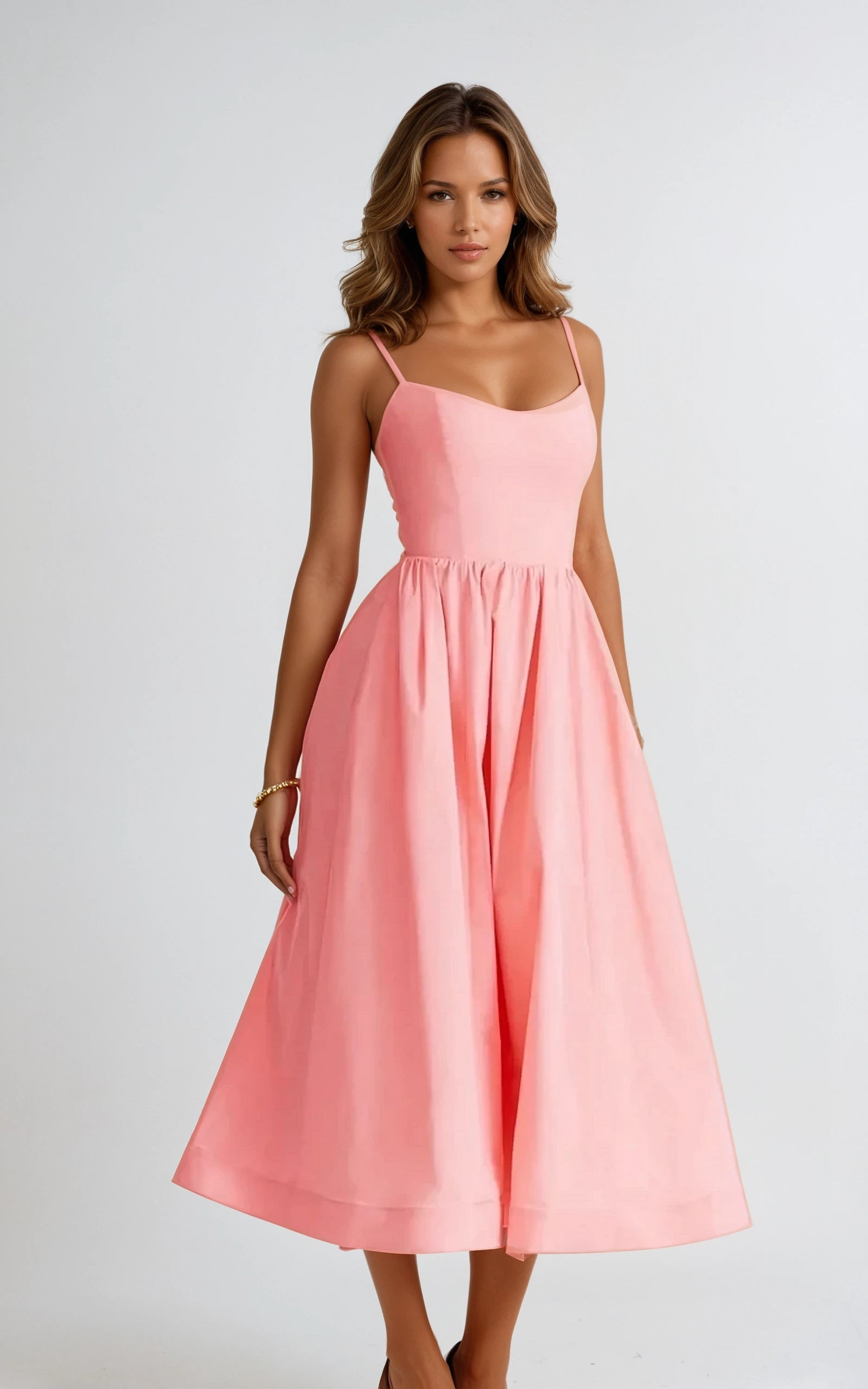 - Design: Structured corset-style bodice with a flowy midi-length skirt.